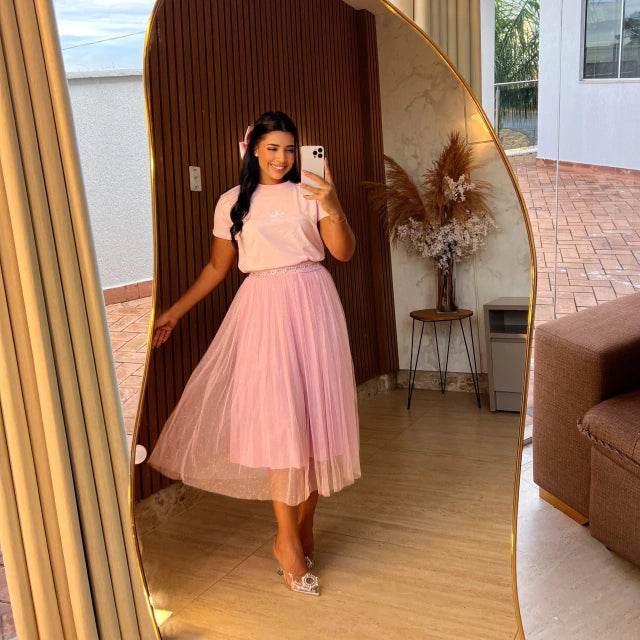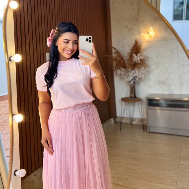 Conjunto Fashion Glow Arrase no look com esse conjunto super estiloso e moderno! Composto por umasaia de tule com brilhoque traz leveza e sofisticação, umaT-shirt Adidaspara um toque esportivo fashionista, e o charme final fica por conta docinto coração, que valoriza a cintura e completa a produção com delicadeza. Ideal para quem ama um visual autêntico, confortável e cheio de personalidade!