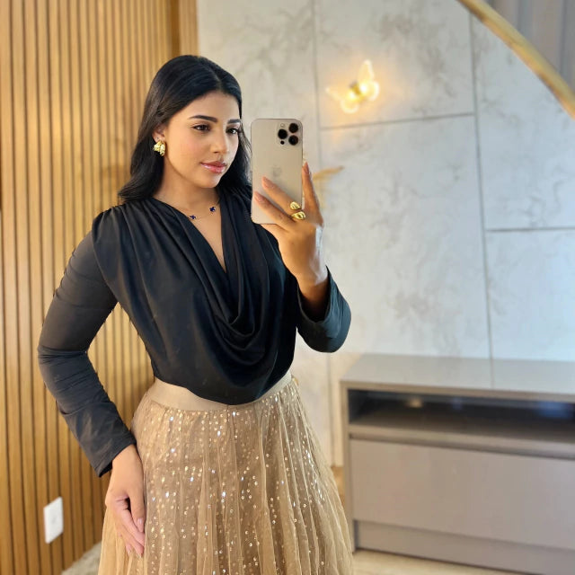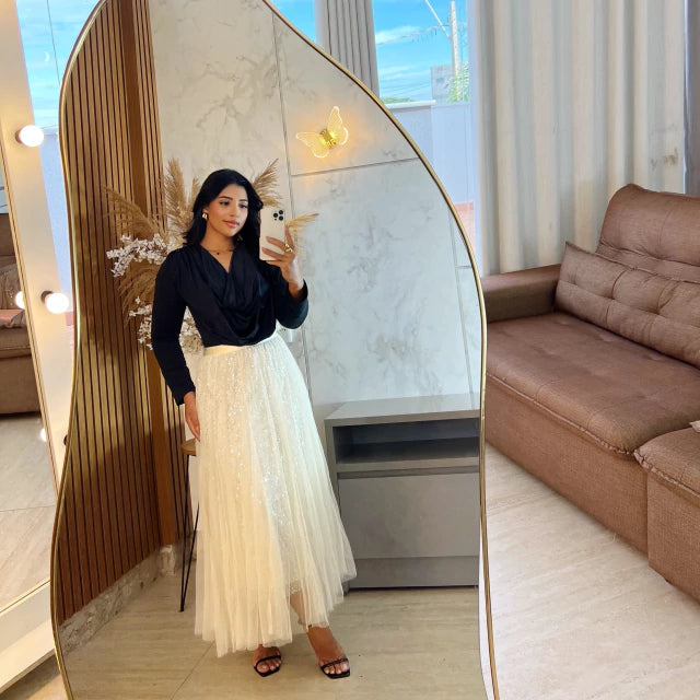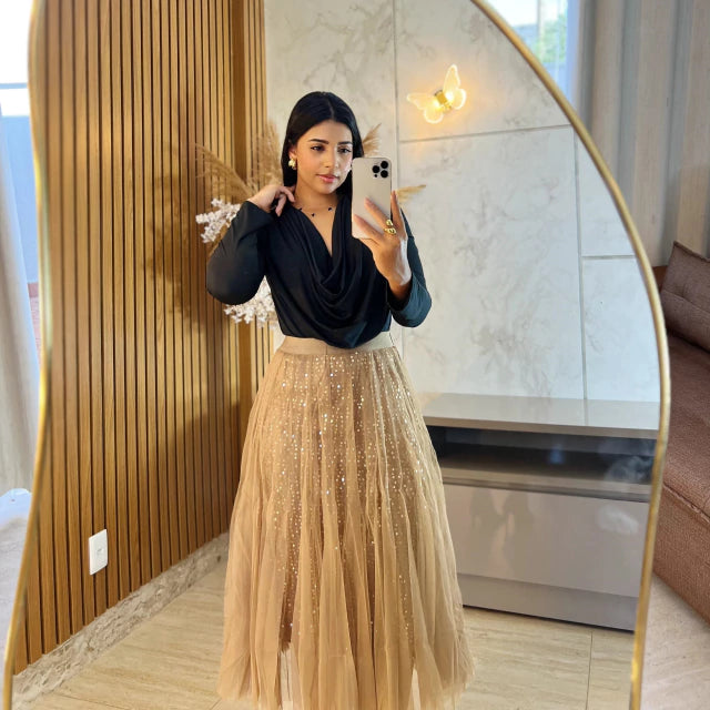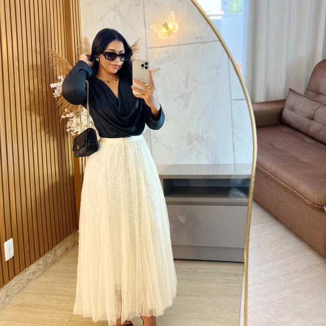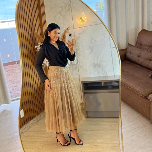 Eleve seu visual com a Saia de paetê Mariaelly e sinta-se radiante em cada momento!