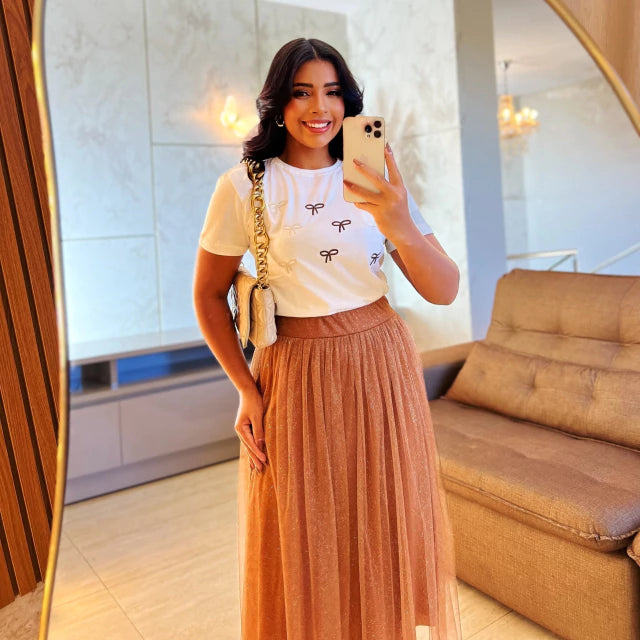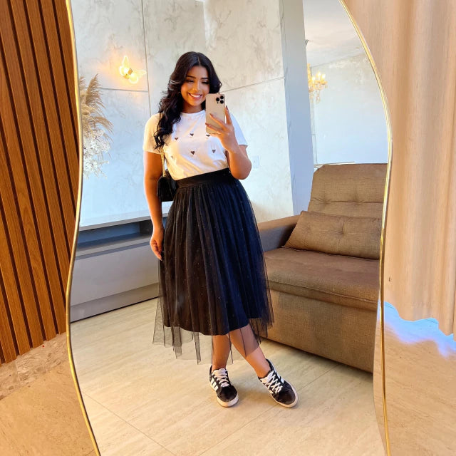 Com um caimento perfeito, a saia valoriza suas curvas, enquanto o tule brilhante adiciona um toque de sofisticação ao seu look. Seja para festas, jantares ou até mesmo um passeio no parque, ela se adapta a qualquer situação.